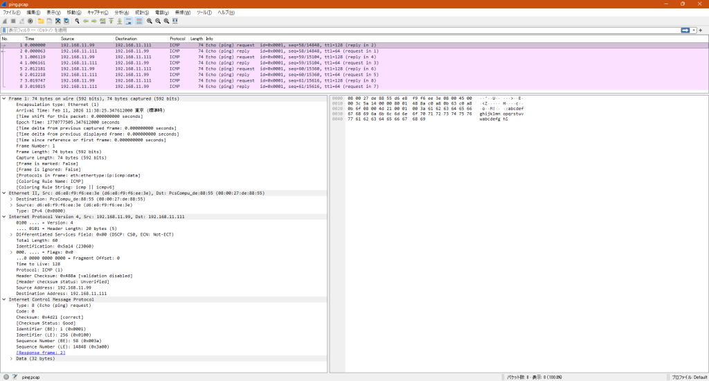 ping.pcapをWiresharkがインストールされているローカルPCに持ってきて、そのファイルを開くと、Wiresharkで参照することができます。